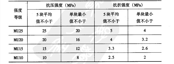 灰砂蒸養磚設備制品按其抗壓強度及抗折強度分為MU25、MU20、MU15、MU10四個強度等級。各強度等級的抗壓強度及抗折強度應符合表的規定。如圖所示