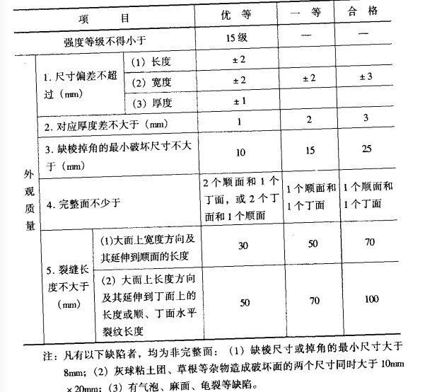 灰砂蒸養磚設備制品根據強度等級、尺寸偏差和外觀質量分為優等品、一等品、合格品三個品級。各品級灰砂蒸養磚的強度等級、尺寸偏差及外觀質量要符合規定,如圖所示。