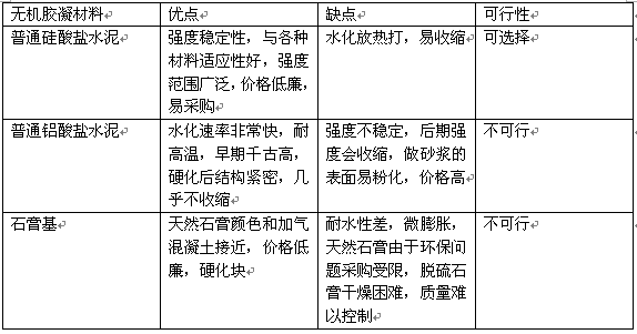 按比例準確計量稱取各種原材料,在攪拌機中依 次加入填料砂、無機膠凝材料、礦物填料和外加劑充分 攪拌均勻,形成低密度蒸壓加氣混凝土專用修補劑。施 工時,按照水:修補劑為1:3的比例混合,攪拌3~5 min后使用,操作時間控制在2 h以內。 3結果與討論 3.1無機膠凝材料的選擇 對各種無機膠凝材料優缺點進行了分析,見表1。
